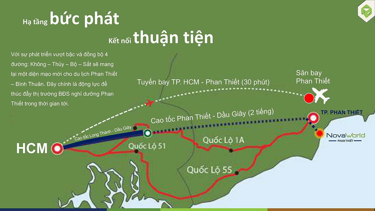 - Tuyến cao tốc Phan Thiết - Dầu Giây khởi công trong tháng 9/2020, dự kiến hoàn thành vào cuối năm 2022. Đồng thời, sân bay Phan Thiết hiện đang được lập thủ tục nâng cấp quy mô từ cấp 4C lên cấp 4E với công suất thiết kế 2 triệu hành khách/năm; cũng như tuyến đường nối từ cao tốc Phan Thiết - Dầu Giây dẫn xuống QL1 nối với đường Hàm Kiệm –Tiến Thành và dẫn xuống đường ven biển đều đang chuẩn bị triển khai xây dựng trong quý cuối năm 2020. Nhờ đó, dự án sẽ có khả năng kết nối tốt hơn với TP HCM và các khu vực khác.